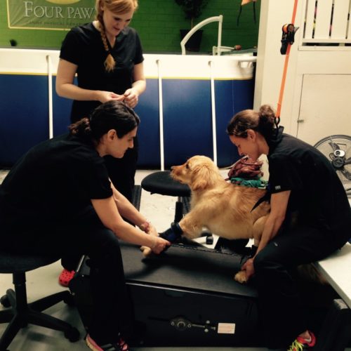 I decided we’d put the underwater treadmill on hold for a while. Clearly that wasn’t going to go too well. We then tried “walking” him around the building in a wheelchair Bryan had put hours into adjusting for him. I tied some therabands to his front feet so that a tech could walk backwards in front of him, essentially pulling his front feet forward. I then sat down behind him on a small dolly and tried to walk his back legs, while another person basically crawled backwards with his treats right in front of his nose to try to get him to move. Comedy ensued all around. We ended up sweating, laughing, and falling on the floor as this poor puppy just looked bewildered. Oh, and did I mention miserable?